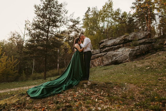 Nastawiliśmy się oczywiście na piękny zachód słońca. Koniec kwietnia był cieplutki i przyjemny, a tego dnia świeciło piękne słońce. Czekając na idealny zachód, zrobiliśmy fotki w zielonej sukni przy skałach nad zalewem Brody. Lubię to miejsce, a w połączeniu z tą nową suknią, wygląda obłędnie.